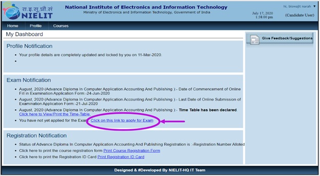 • Result of the examinations once published will be visible to candidate on their dashboard. The result will also be shared with the training institute through NIELIT Regional Centre.